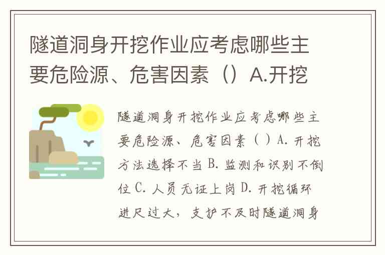 隧道洞身开挖作业的危险源涵盖施工工艺、监测管理、人员操作等多个维度,直接影响施工安全与工程质量。根据安全技术交底及工程实践,A.开挖方法选择不当、B.监测和识别不到位、C.人员无证上岗、D.开挖循环进尺过大,支护不及时均为核心危害因素,具体关联如下:
