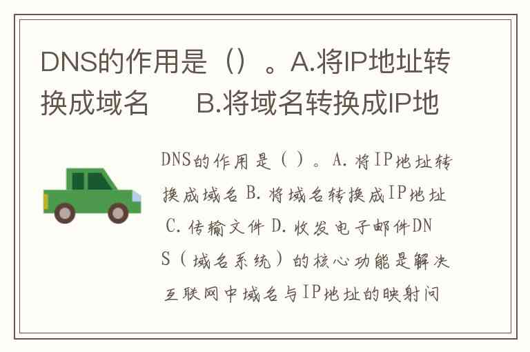 DNS的作用是()。A.将IP地址转换成域名 B.将域名转换成IP地址 C.传输文件 D.收发电子邮件