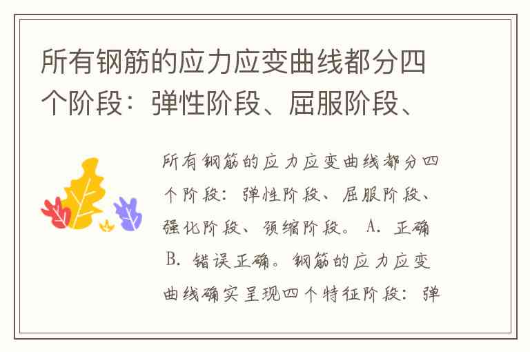所有钢筋的应力应变曲线都分四个阶段:弹性阶段、屈服阶段、强化阶段、颈缩阶段。 A. 正确 B. 错误