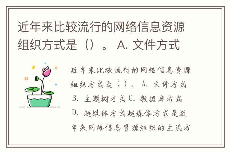 近年来比较流行的网络信息资源组织方式是()。 A. 文件方式 B. 主题树方式 C. 数据库方式 D. 超媒体方式