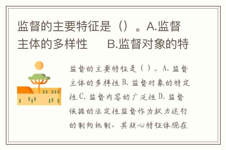 监督的主要特征是()。A.监督主体的多样性 B.监督对象的特定性 C.监督内容的广泛性 D.监督依据的法定性