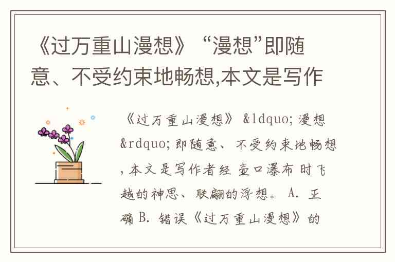《过万重山漫想》 “漫想”即随意、不受约束地畅想,本文是写作者经 壶口瀑布 时飞越的神思、联翩的浮想。 A. 正确 B. 错误