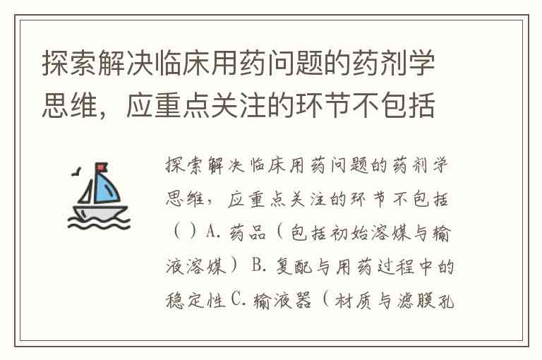探索解决临床用药问题的药剂学思维,应重点关注的环节不包括()A.药品(包括初始溶媒与输液溶媒) B.复配与用药过程中的稳定性 C.输液器(材质与滤膜孔径) D.药品价格