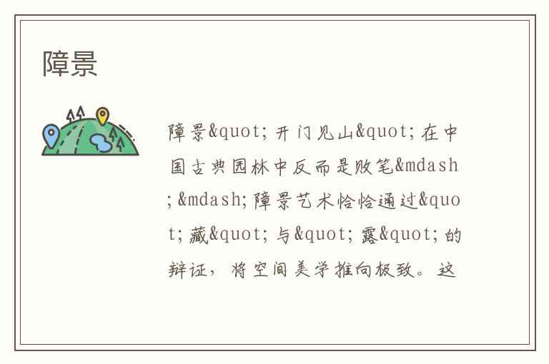 "开门见山"在中国古典园林中反而是败笔——障景艺术恰恰通过"藏"与"露"的辩证,将空间美学推向极致。这种被誉为"抑景"的造园手法,核心在于欲扬先抑、欲露先藏,利用山石、植物、建筑等元素遮挡主景,让游人在迂回探索中获得"山重水复疑无路,柳暗花明又一村"的审美惊喜。它如同中国水墨画中的"留白",通过视觉的暂时阻断,激发观者对未知景致的想象,最终在豁然开朗时获得加倍的心理满足。