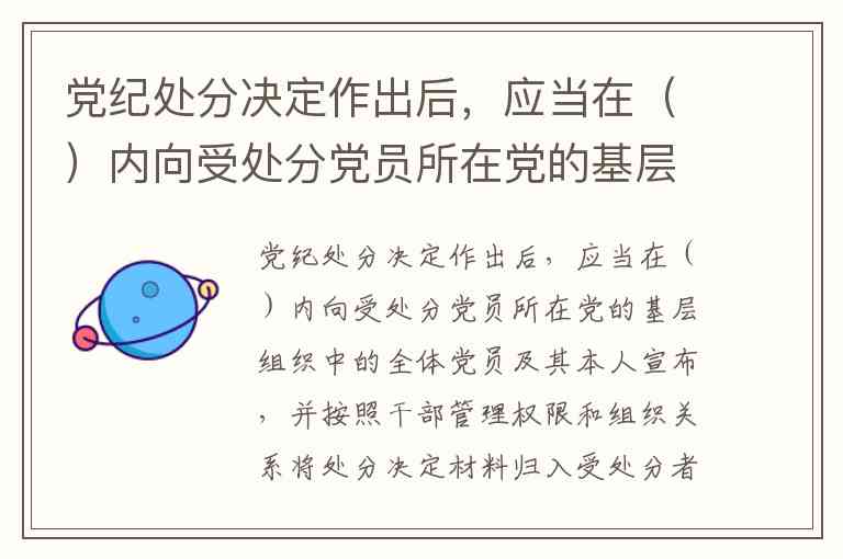 党纪处分决定作出后,应当在()内向受处分党员所在党的基层组织中的全体党员及其本人宣布,并按照干部管理权限和组织关系将处分决定材料归入受处分者档案。A、一个月 B、二个月 C、三个月 D、四个月