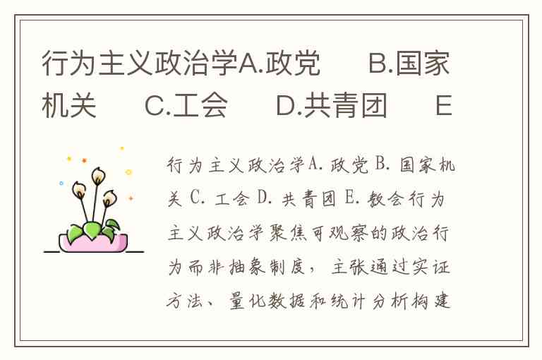 行为主义政治学聚焦可观察的政治行为而非抽象制度,主张通过实证方法、量化数据和统计分析构建科学理论。其核心特征包括:研究对象从“理想政治行为”转向“实际政治行为”,强调价值中立与社会科学统一性,尤其关注个体和群体的政治参与模式。