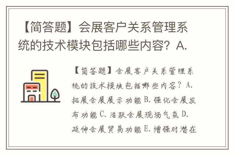 【简答题】会展客户关系管理系统的技术模块包括哪些内容?A.拓展会展展示功能 B.强化会展发布功能 C.活跃会展现场气氛 D.延伸会展贸易功能 E.增强对潜在客户的吸引力