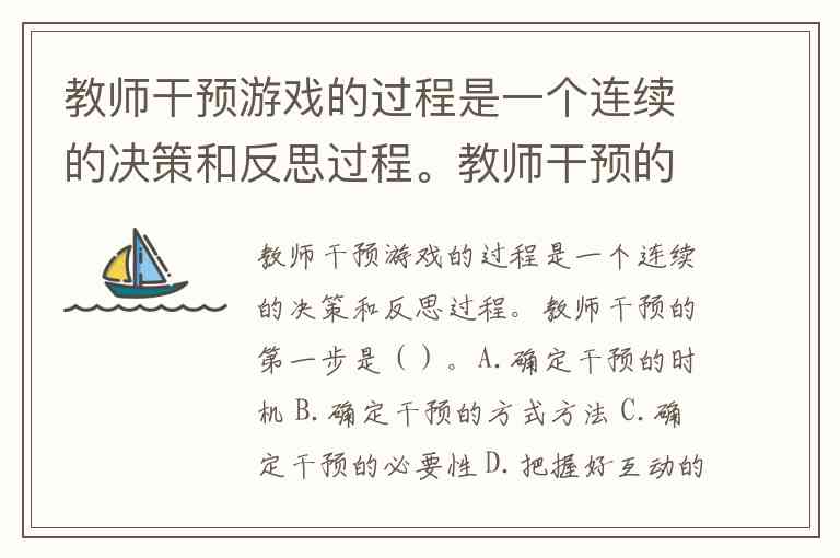 教师干预游戏的过程是一个连续的决策和反思过程。教师干预的第一步是()。A.确定干预的时机 B.确定干预的方式方法 C.确定干预的必要性 D.把握好互动的节奏