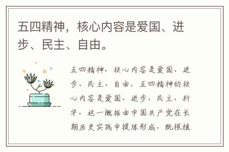 五四精神的核心内容是爱国、进步、民主、科学,这一概括由中国共产党在长期历史实践中提炼形成,既根植于五四运动的历史土壤,又随着时代发展不断丰富内涵。习近平总书记明确指出,五四运动孕育的伟大五四精神,其核心是爱国主义。