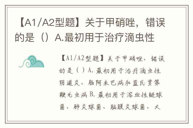 不良反应方面,甲硝唑常见消化道反应(恶心、呕吐、腹痛)、神经系统症状(头痛、肢体麻木、多发性神经炎)及皮肤过敏(皮疹、瘙痒)等,大剂量可能引发抽搐或白细胞减少,这些反应多为可逆性,停药后可恢复。需特别注意,甲硝唑对需氧菌如溶血性链球菌、肺炎球菌等无效,选项B混淆了其抗菌谱与初始适应症,是唯一错误表述。
