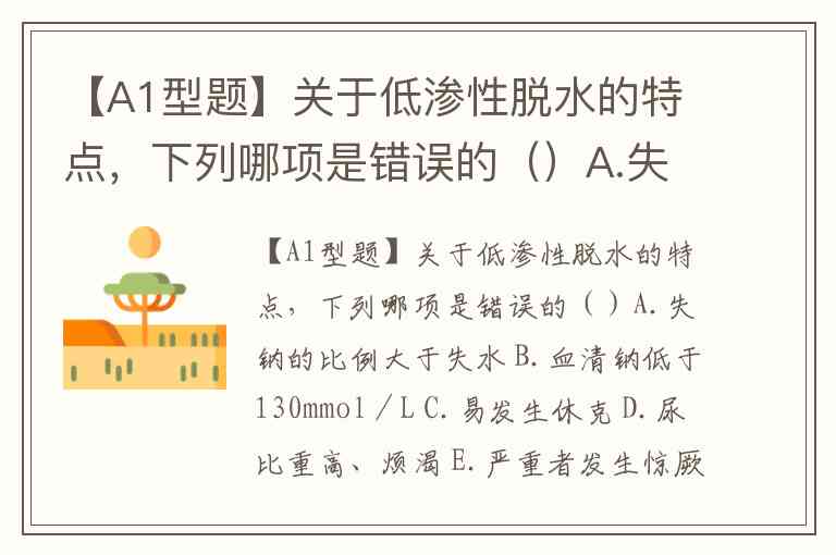 【A1型题】关于低渗性脱水的特点,下列哪项是错误的()A.失钠的比例大于失水 B.血清钠低于130mmol/L C.易发生休克 D.尿比重高、烦渴 E.严重者发生惊厥和昏迷