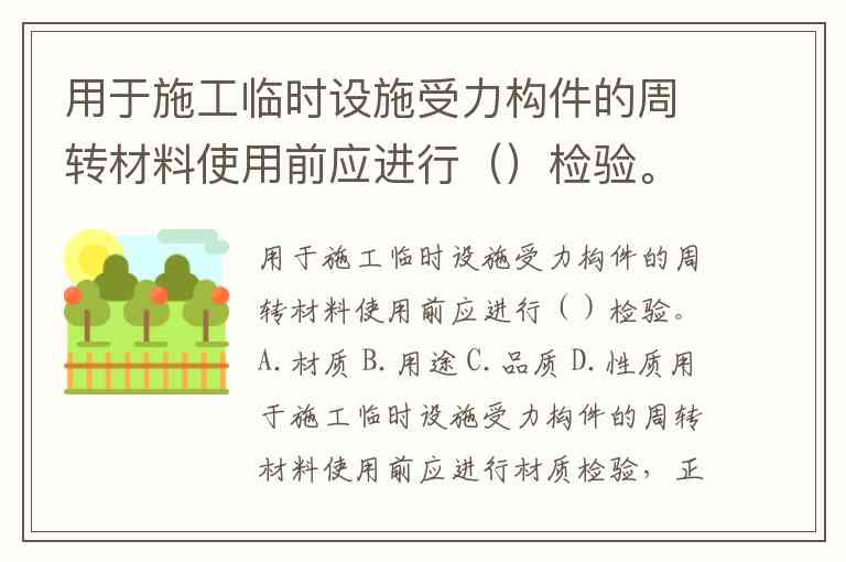 用于施工临时设施受力构件的周转材料使用前应进行()检验。A.材质 B.用途 C.品质 D.性质