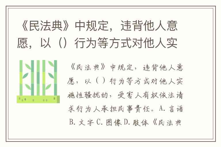 《民法典》中规定,违背他人意愿,以()行为等方式对他人实施性骚扰的,受害人有权依法请求行为人承担民事责任。A.言语 B.文字 C.图像 D.肢体