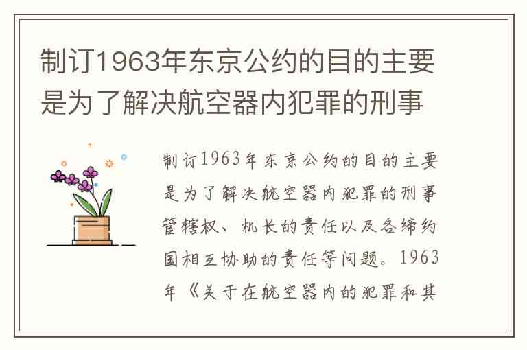 制订1963年东京公约的目的主要是为了解决航空器内犯罪的刑事管辖权、机长的责任以及各缔约国相互协助的责任等问题。