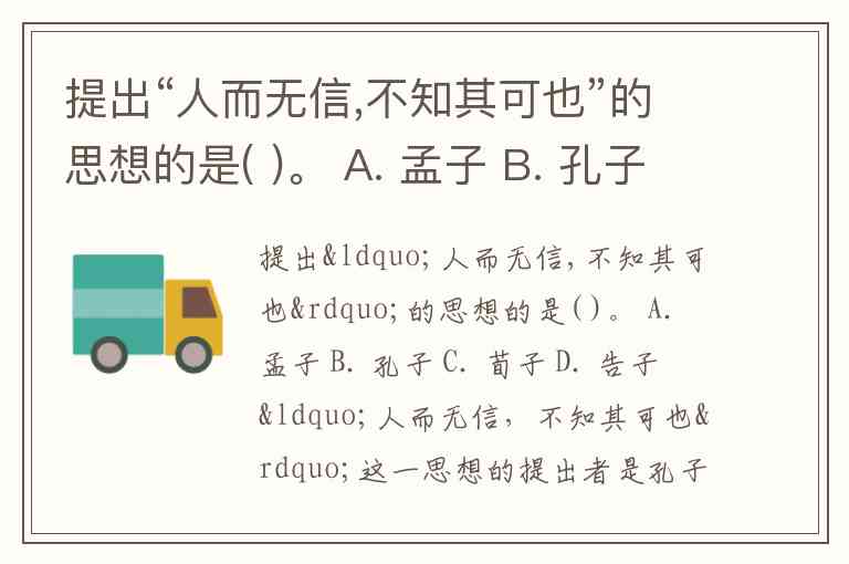 提出“人而无信,不知其可也”的思想的是( )。 A. 孟子 B. 孔子 C. 荀子 D. 告子