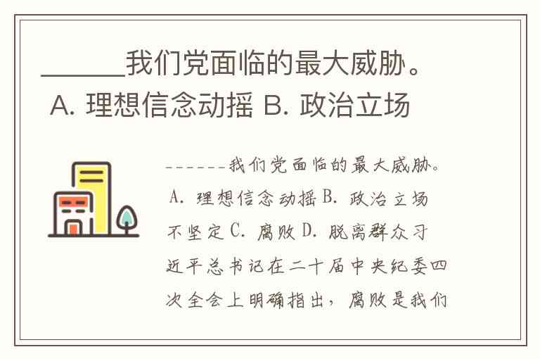 ______我们党面临的最大威胁。 A. 理想信念动摇 B. 政治立场不坚定 C. 腐败 D. 脱离群众