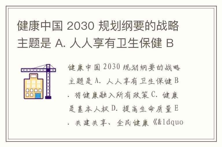 健康中国 2030 规划纲要的战略主题是 A. 人人享有卫生保健 B. 将健康融入所有政策 C. 健康是基本人权 D. 提高生命质量 E. 共建共享、全民健康