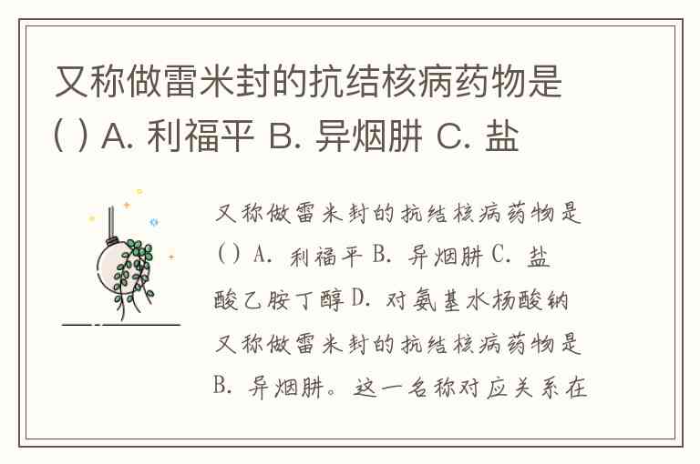 又称做雷米封的抗结核病药物是( ) A. 利福平 B. 异烟肼 C. 盐酸乙胺丁醇 D. 对氨基水杨酸钠