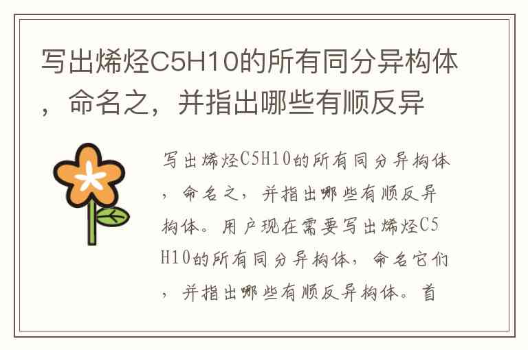 用户现在需要写出烯烃C5H10的所有同分异构体,命名它们,并指出哪些有顺反异构体。首先,我得明确C5H10的不饱和度是1,因为饱和烷烃是C5H12,这里少了2个H,所以是烯烃或环烷烃。但题目明确说是烯烃,所以排除环烷烃,只考虑含有一个碳碳双键的烯烃。