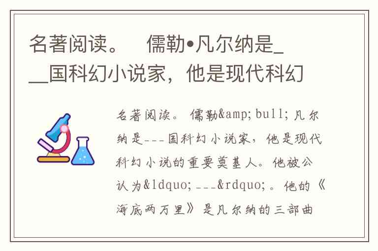 名著阅读。 儒勒•凡尔纳是___国科幻小说家,他是现代科幻小说的重要奠基人。他被公认为“___”。他的《海底两万里》是凡尔纳的三部曲之二,其余两部是:第一部___,第三部是___。《海底两万里》主要讲述___(“鹦鹉螺号”)潜艇的故事。潜艇是船长尼摩在大洋中的一座荒岛上秘密建造的,船身坚固,利用___来提供能源。