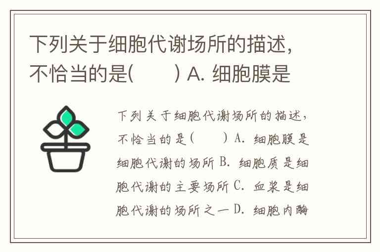 下列关于细胞代谢场所的描述,不恰当的是( ) A. 细胞膜是细胞代谢的场所 B. 细胞质是细胞代谢的主要场所 C. 血浆是细胞代谢的场所之一 D. 细胞内酶行使功能的场所也是细胞代谢的场所