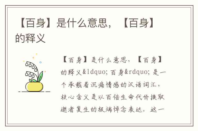 “百身”是一个承载着沉痛情感的汉语词汇,核心含义是以百倍生命代价换取逝者复生的极端悼念表达。这一典故出自《诗经·秦风·黄鸟》中“如可赎兮,人百其身”的诗句,原是秦人哀悼为秦穆公殉葬的子车氏三良时发出的悲叹——面对三位贤臣的殉葬墓穴,人们悲痛欲绝地呼喊:“如果可以赎回他们的性命,愿以百人之命相抵!”这里的“百”并非实指数量,而是通过夸张的生命量化,构建出“以众换寡”的情感张力,将失去贤才的痛惜推向极致。