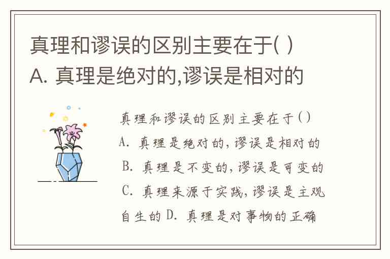 真理和谬误的区别主要在于( ) A. 真理是绝对的,谬误是相对的 B. 真理是不变的,谬误是可变的 C. 真理来源于实践,谬误是主观自生的 D. 真理是对事物的正确反映,谬误是对事物的歪曲反映