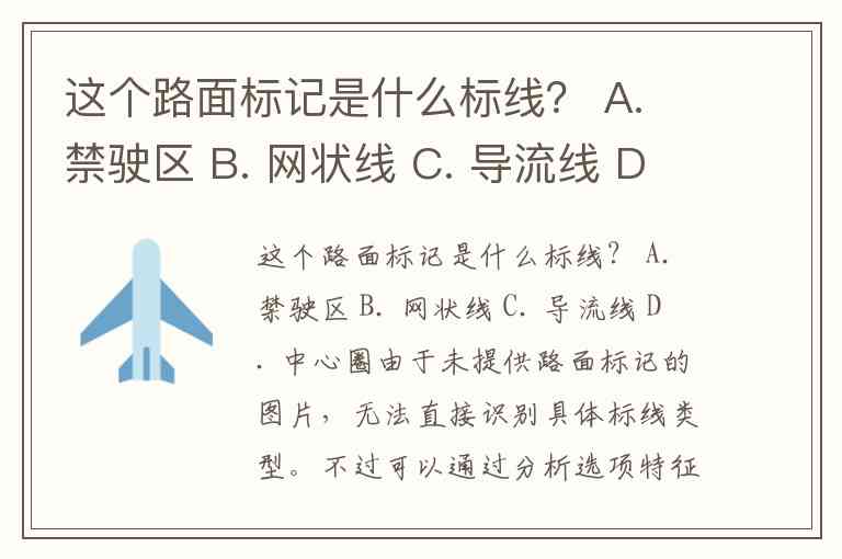 由于未提供路面标记的图片,无法直接识别具体标线类型。不过可以通过分析选项特征帮助判断:网状线通常为黄色方形边框内有交叉网格状线条,常见于医院、学校等单位门口或交通繁忙路口,用于禁止车辆在该区域内停车,即使红灯时也不得停留;导流线多为白色V形或斜纹线,用于引导车辆按规定路线行驶;中心圈是路口中心的白色圆圈或菱形区域,指示车辆转弯时需绕圈行驶;禁驶区并非标准交通标线术语。若标记为黄色网格状,答案最可能是 B. 网状线。日常驾驶中,遇到此类标线需注意避免停车,确保紧急通道畅通——你是否在特定路口见过类似标记呢?