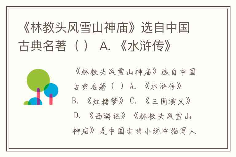 《林教头风雪山神庙》选自中国古典名著( ) A. 《水浒传》 B. 《红楼梦》 C. 《三国演义》 D. 《西游记》