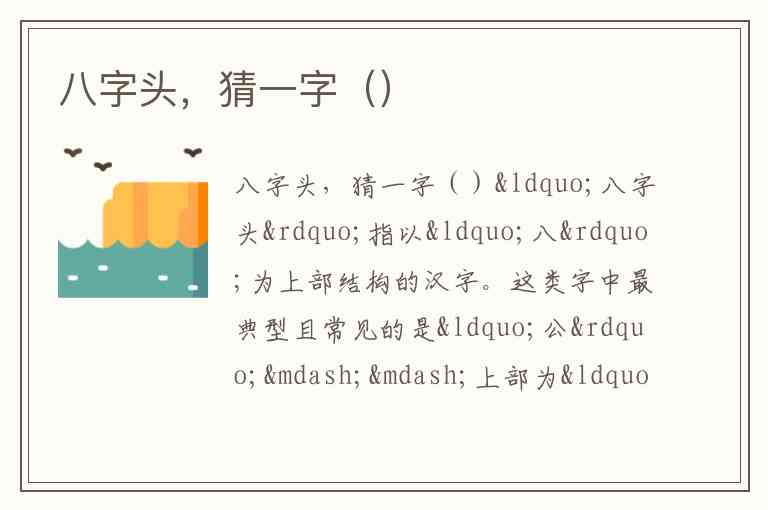 “八字头”指以“八”为上部结构的汉字。这类字中最典型且常见的是“公”——上部为“八”,下部为“厶”(sī,古同“私”),组合成“公”字,符合“八字头”的描述。