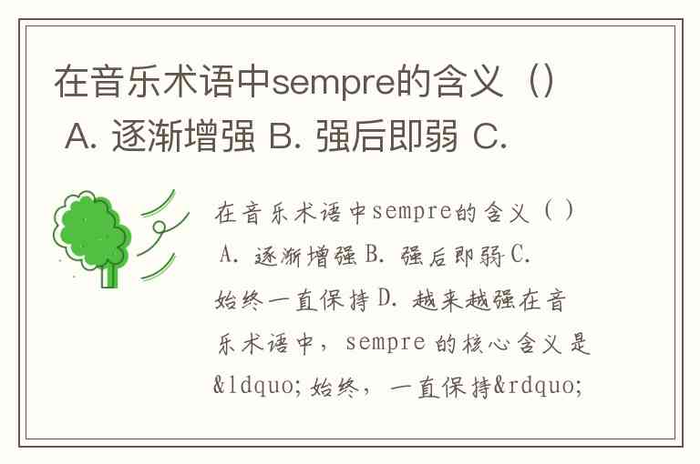 在音乐术语中sempre的含义() A. 逐渐增强 B. 强后即弱 C. 始终一直保持 D. 越来越强