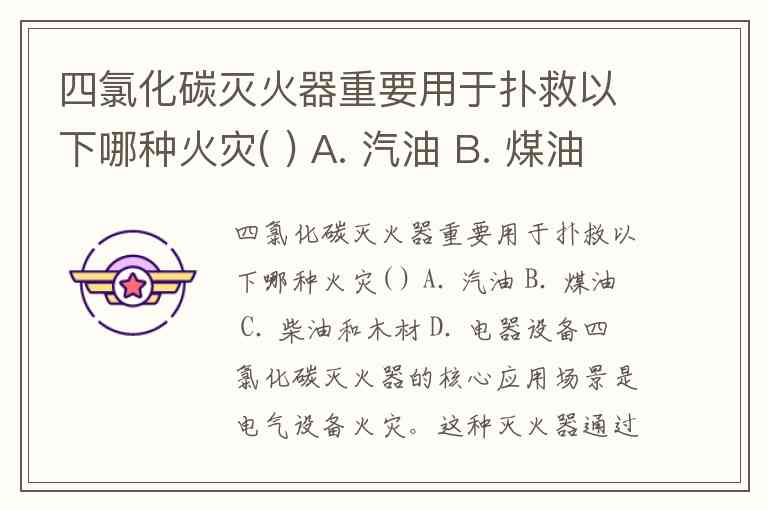 四氯化碳灭火器重要用于扑救以下哪种火灾( ) A. 汽油 B. 煤油 C. 柴油和木材 D. 电器设备