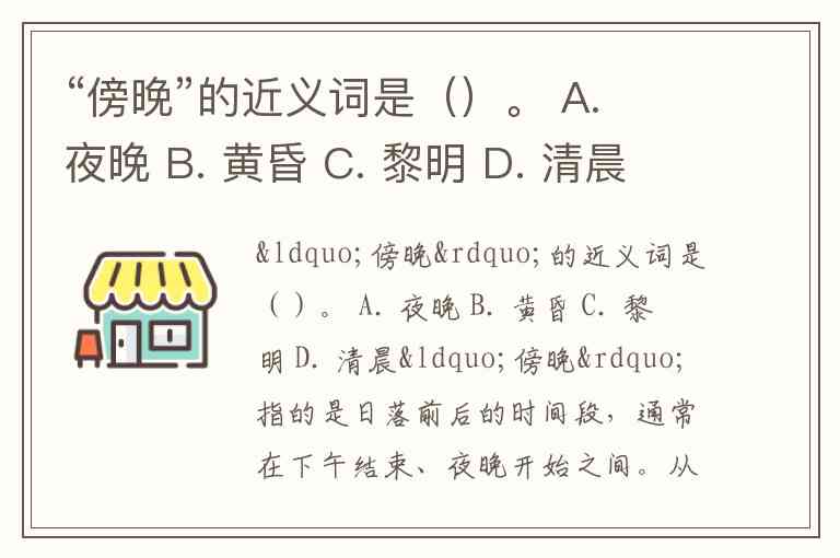 “傍晚”的近义词是()。 A. 夜晚 B. 黄昏 C. 黎明 D. 清晨