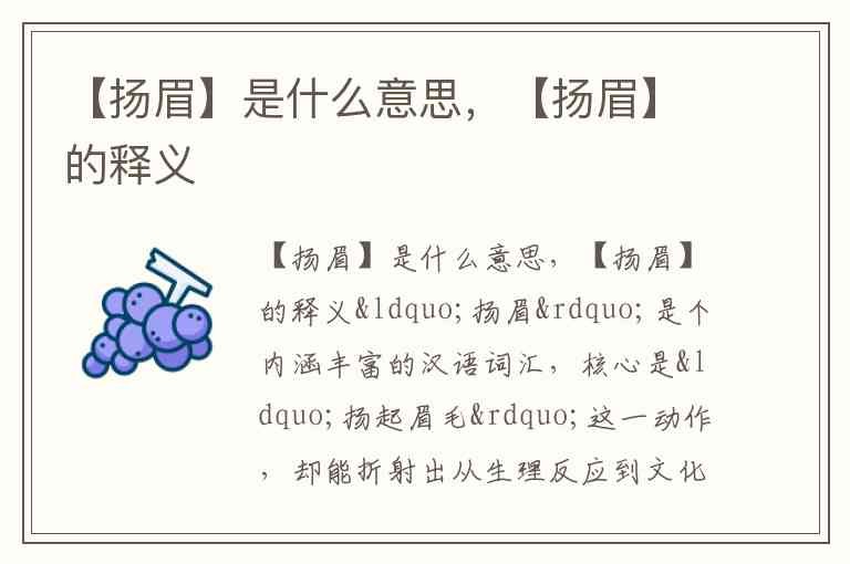 “扬眉”是个内涵丰富的汉语词汇,核心是“扬起眉毛”这一动作,却能折射出从生理反应到文化象征的多重含义。它最基础的意思是“举目”,即抬起眼睛看,比如《列子·汤问》中“扬眉而望之”,描述的就是离朱子羽擦亮眼睛远望的动作。