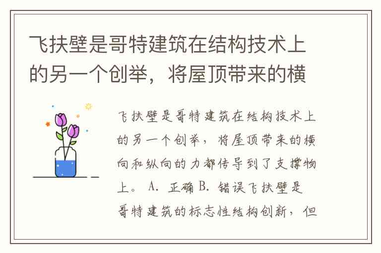飞扶壁是哥特建筑在结构技术上的另一个创举,将屋顶带来的横向和纵向的力都传导到了支撑物上。 A. 正确 B. 错误