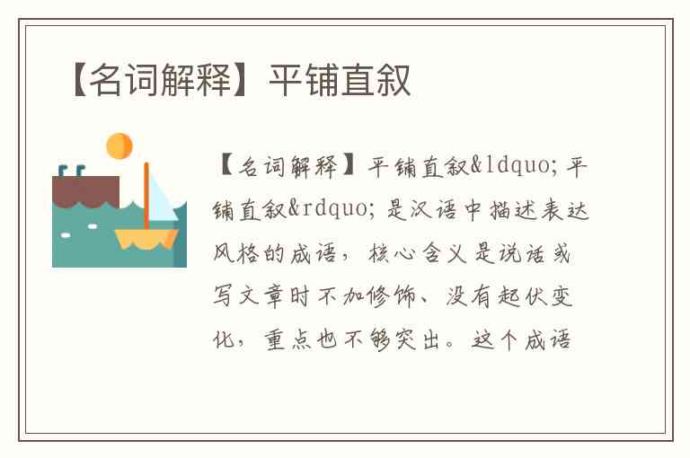 其源头可追溯至明清文献,明代祁彪佳在《远山堂曲品》中评价作品“记孟尝君事,平铺直叙,祥略稍未得法”,清代钱谦益则在《初学集》里提及“平铺直序(叙),以为古今未有此体”,可见它最初常被用于批评写作技法的单调。作为联合式成语,它可作谓语、宾语等多种成分,例如“巴金《春》中周氏虽然只是在平铺直叙地说话,但声音里却含了一点不满”。