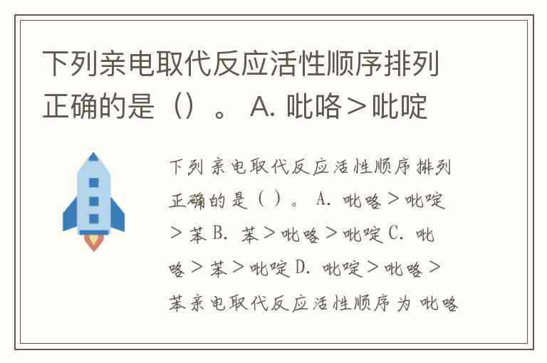 下列亲电取代反应活性顺序排列正确的是()。 A. 吡咯>吡啶>苯 B. 苯>吡咯>吡啶 C. 吡咯>苯>吡啶 D. 吡啶>吡咯>苯