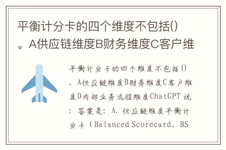 供应链维度并不是平衡计分卡中的一个标准维度。尽管供应链管理在很多企业中非常重要,但它通常作为内部业务流程维度的一部分来考虑,而不是独立的维度。