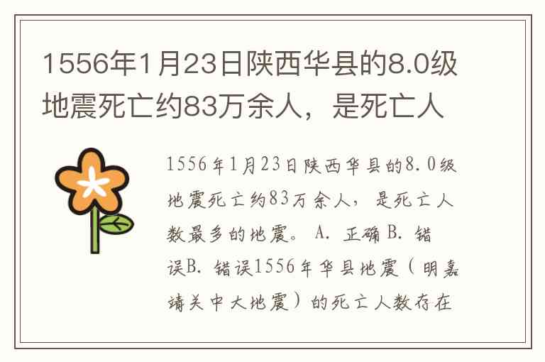 1556年1月23日陕西华县的8.0级地震死亡约83万余人,是死亡人数最多的地震。 A. 正确 B. 错误