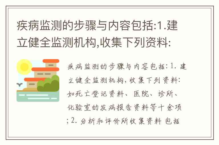 疾病监测通过系统化收集、分析和反馈健康相关数据,能够全面掌握疾病动态并支持公共卫生行动。根据描述,监测机构收集死亡登记、发病报告等多维度资料,分析疾病自然史、变化趋势及影响因素,并将结果及时反馈以指导防治。这一完整流程覆盖了了解现状(资料收集与分析)、预测趋势(变化规律研判)、支持决策(结果反馈给卫生部门)和控制疾病(采取防治措施)的全链条功能。