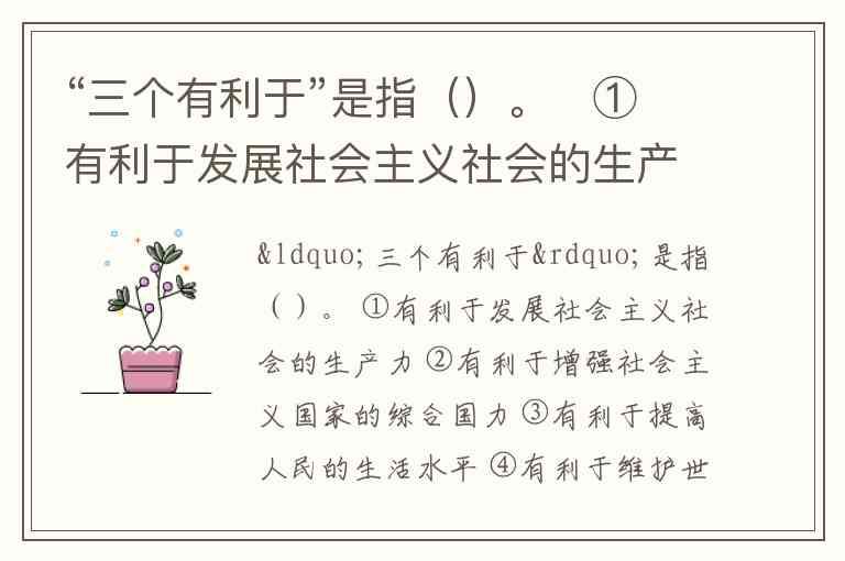 “三个有利于”是指()。 ①有利于发展社会主义社会的生产力 ②有利于增强社会主义国家的综合国力 ③有利于提高人民的生活水平 ④有利于维护世界和平,促进共同发展 A. ①②③ B. ①②④ C. ②③④ D. ①③④