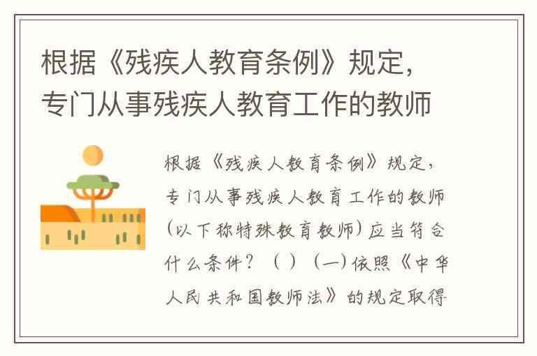 根据《残疾人教育条例》规定,专门从事残疾人教育工作的教师(以下称特殊教育教师)应当符合什么条件?() (一)依照《中华人民共和国教师法》的规定取得教师资格; (二)特殊教育专业毕业或者经省、自治区、直辖市人民政府教育行政部门组织的特殊教育专业培训并考核合格。 A. (一) B. (一)(二)