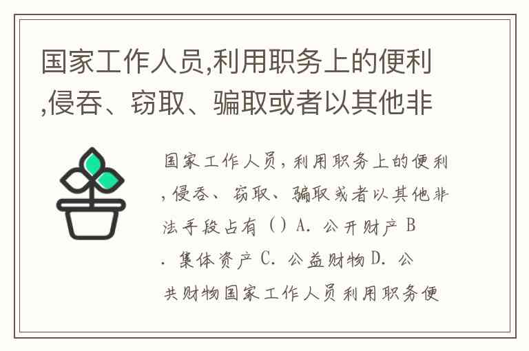 国家工作人员,利用职务上的便利,侵吞、窃取、骗取或者以其他非法手段占有 ( ) A. 公开财产 B. 集体资产 C. 公益财物 D. 公共财物