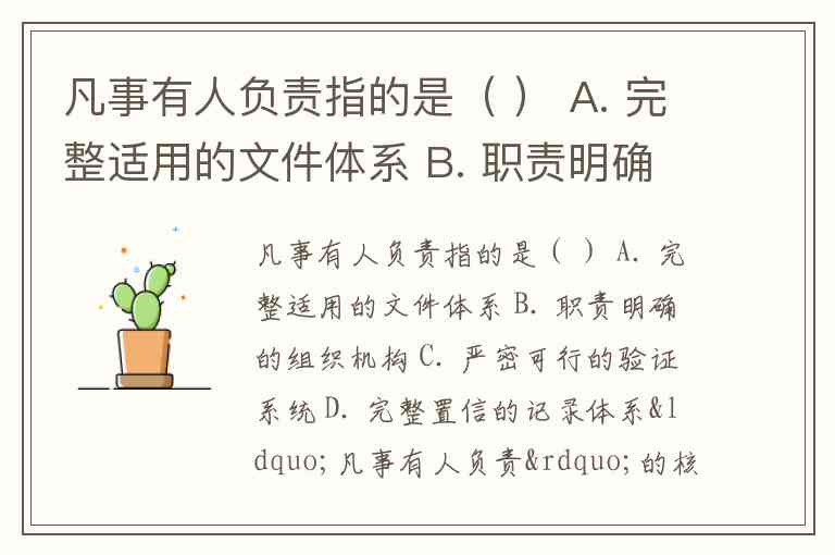 凡事有人负责指的是( ) A. 完整适用的文件体系 B. 职责明确的组织机构 C. 严密可行的验证系统 D. 完整置信的记录体系