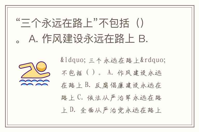 “三个永远在路上”不包括()。 A. 作风建设永远在路上 B. 反腐倡廉建设永远在路上 C. 依法从严治军永远在路上 D. 全面从严治党永远在路上