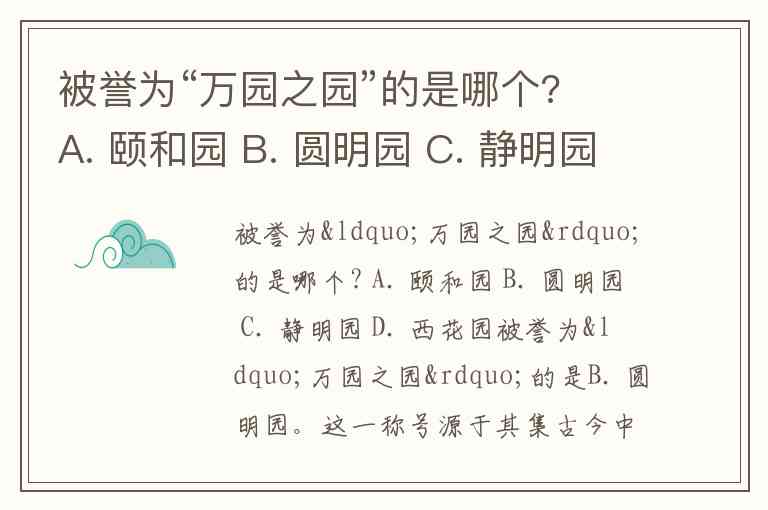 被誉为“万园之园”的是哪个? A. 颐和园 B. 圆明园 C. 静明园 D. 西花园
