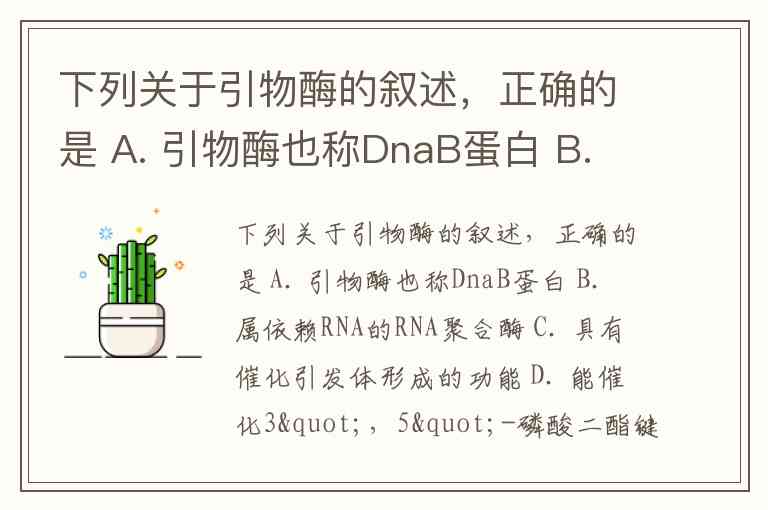 下列关于引物酶的叙述,正确的是 A. 引物酶也称DnaB蛋白 B. 属依赖RNA的RNA聚合酶 C. 具有催化引发体形成的功能 D. 能催化3",5"-磷酸二酯键生成