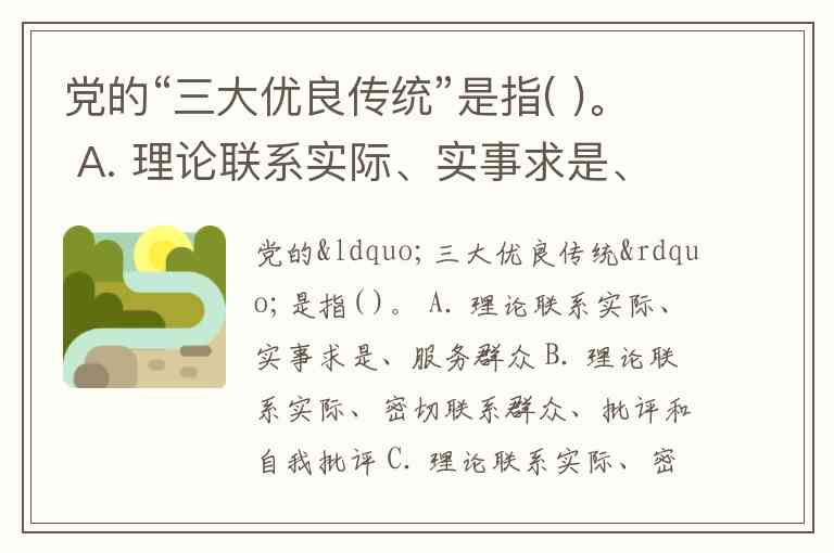 党的“三大优良传统”是指( )。 A. 理论联系实际、实事求是、服务群众 B. 理论联系实际、密切联系群众、批评和自我批评 C. 理论联系实际、密切联系群众、坚持实事求是 D. 理论联系实际、实事求是、批评和自我批评