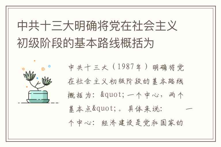 中共十三大(1987年)明确将党在社会主义初级阶段的基本路线概括为: