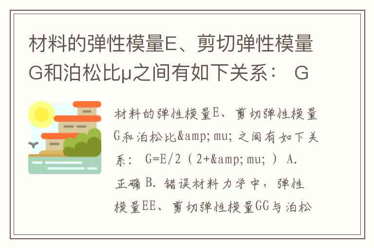 材料力学中,弹性模量E、剪切弹性模量G与泊松比μ的关系由广义胡克定律推导得出,正确表达式为G=E2(1+μ)。题目中的公式分母为2(2+μ),错误地将(1+μ)写成了(2+μ),因此该关系不成立。
